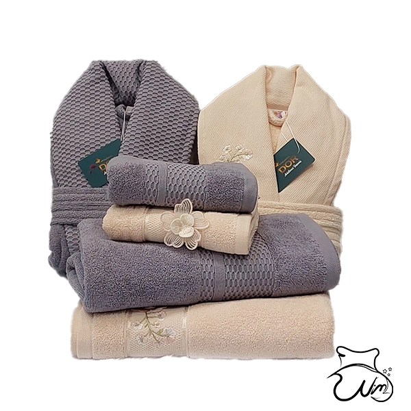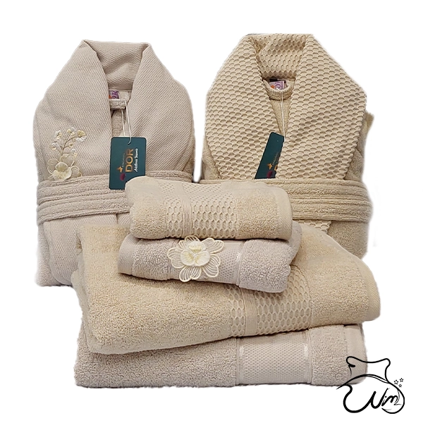 در این ست یک حوله تنپوش یا پالتویی مردانه و یک حوله تن پوش زنانه قرار دارد که حوله مردانه طرح ساده دارد و حوله زنانه دارای طرح در تمام سطح حوله است. قد حوله مردانه 110 سانتیمتر و قد حوله زنانه برابر با 100 سانتیمتر است.